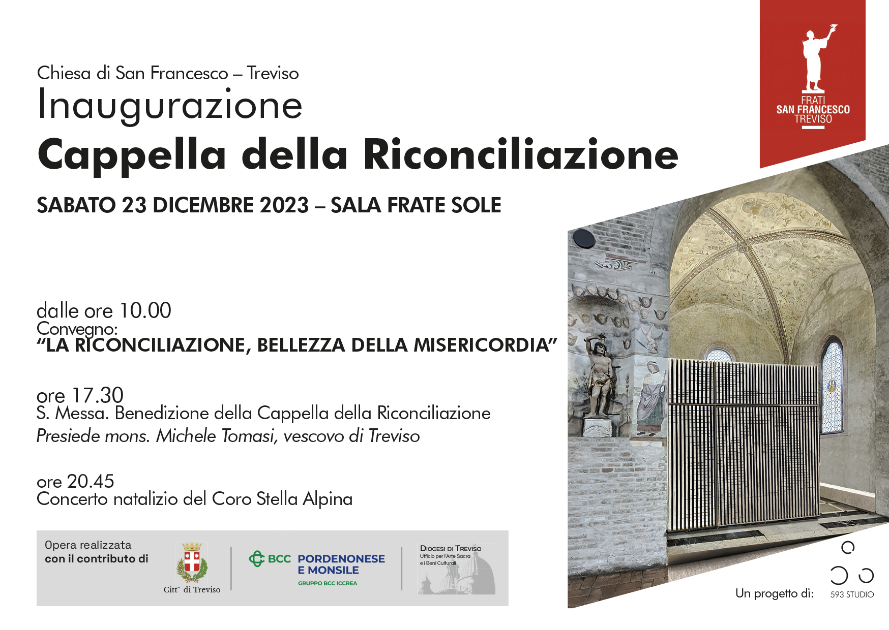 Inaugurazione della Cappella della Riconciliazione | Chiesa di San Francesco Convegno La Riconciliazione, bellezza della Misericordia Progettazione architettonica e Direzione artistica593 Studio | Michele Sbrissa Architetto, con Raffaele Villano e Emma Mattiuzzo23 dicembre 2023 Lo staff di 593 Studio è felice di invitare clienti, amiche e amici, sostenitric