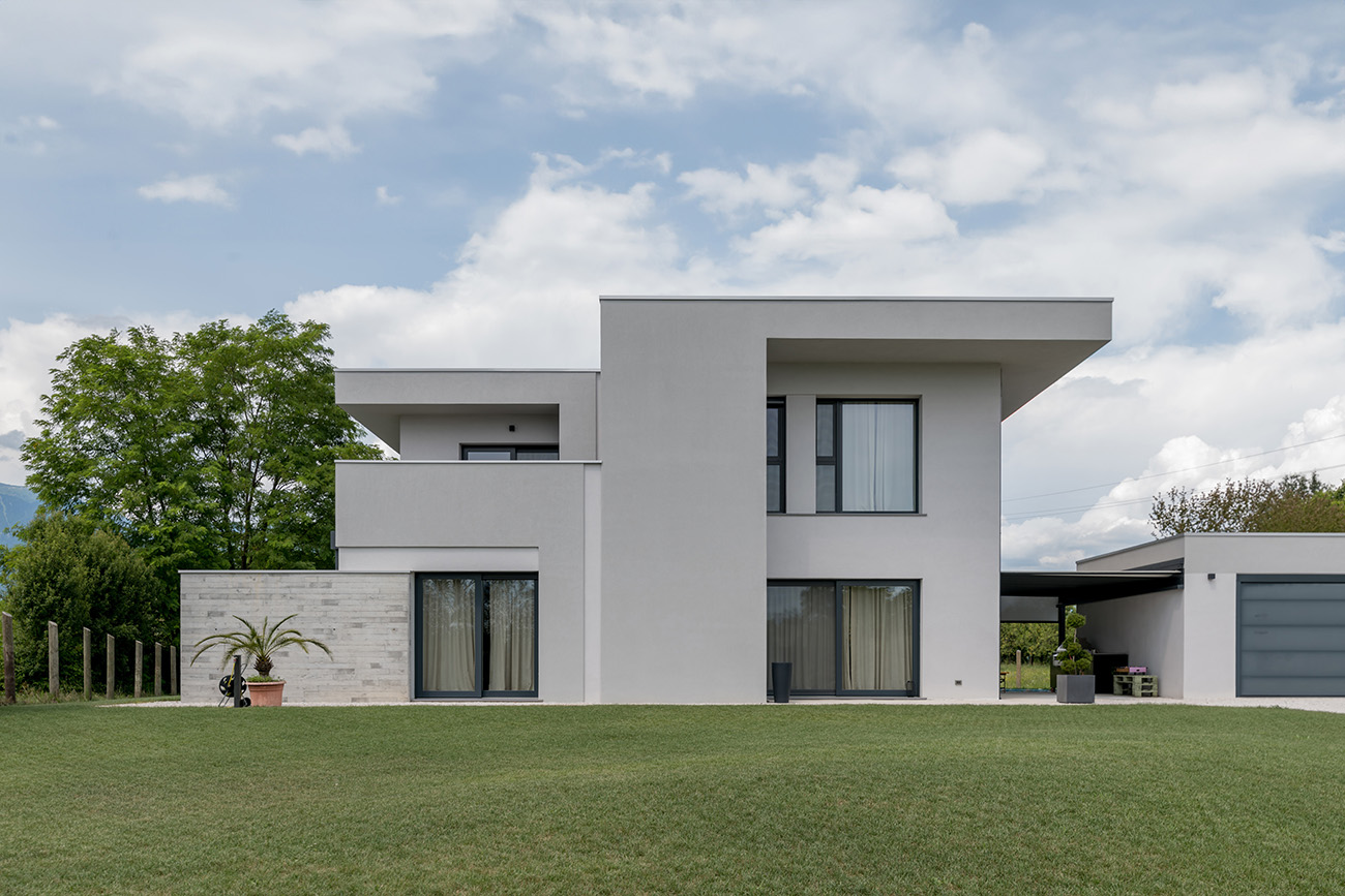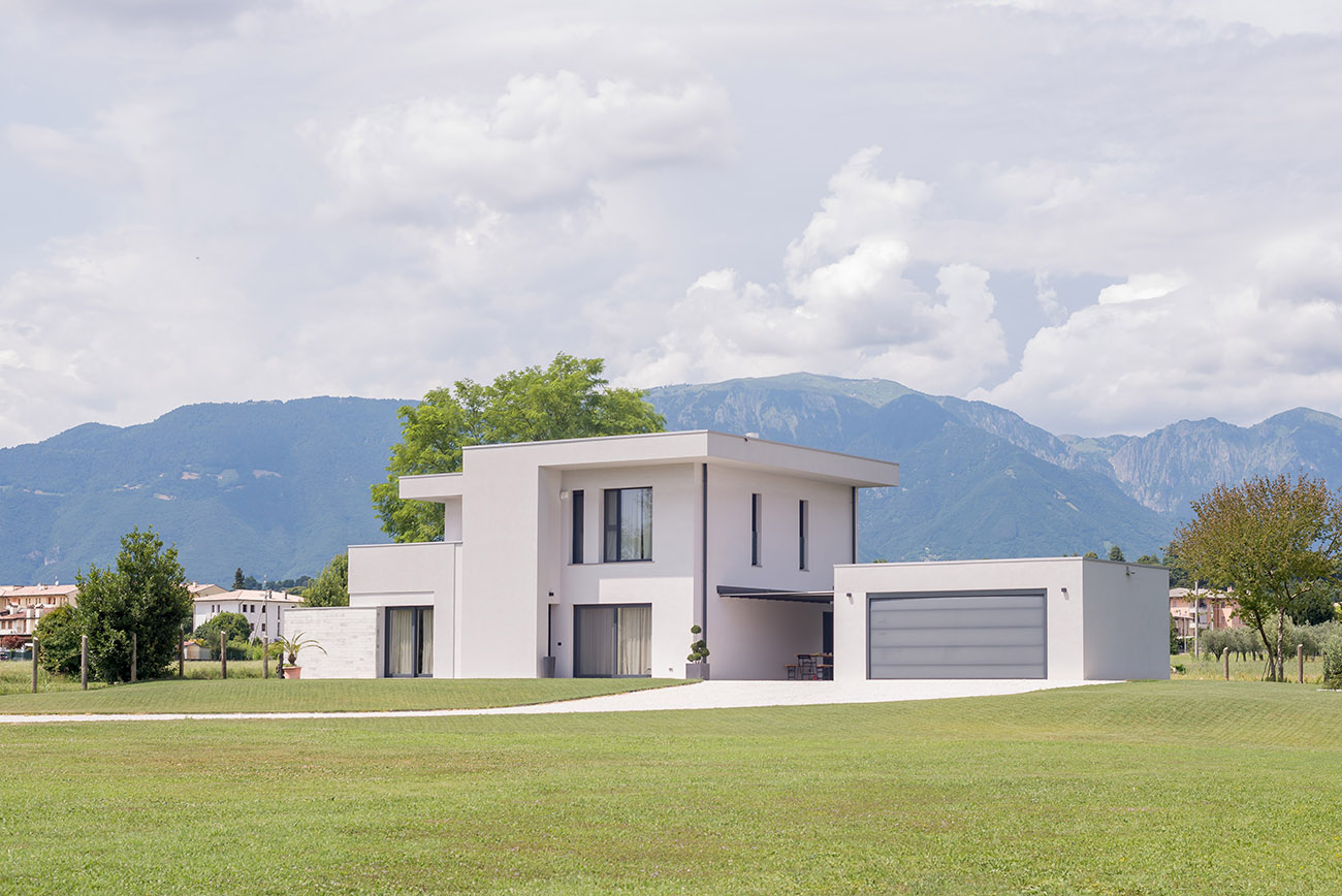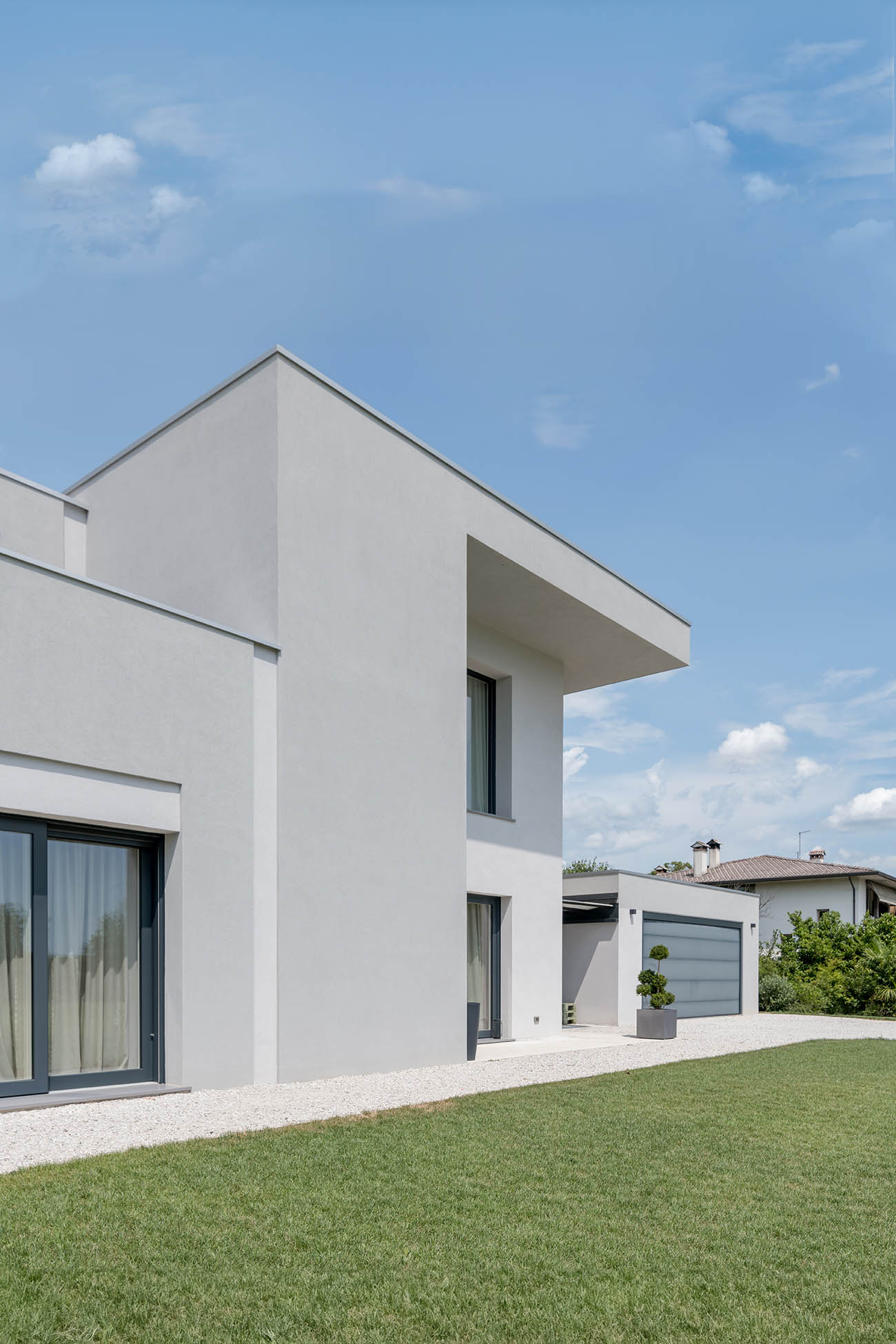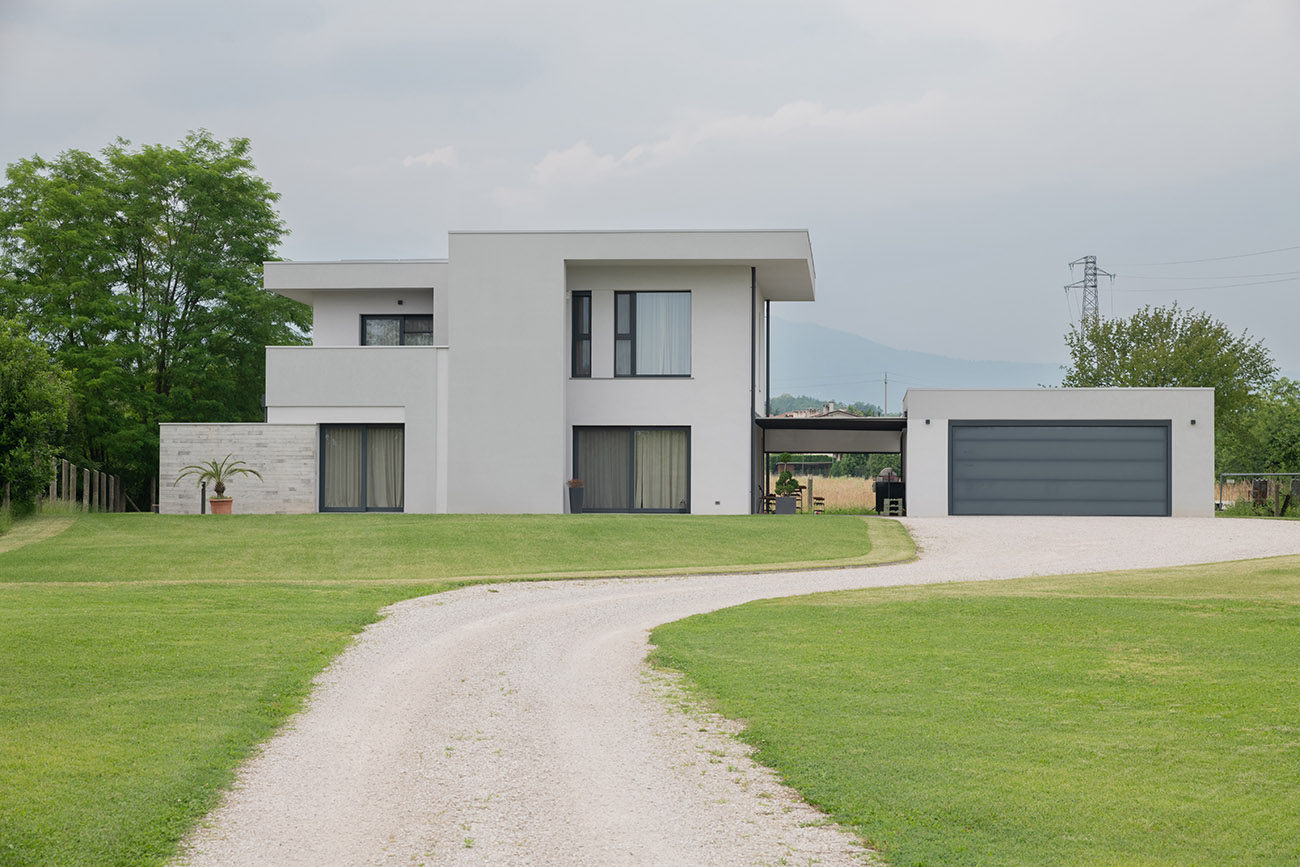 L'edificio si sviluppa su due piani, confrontandosi con un sito urbanisticamente residuale, collocato tra la zona semiperiferica abitata e la campagna agricola a sud. Il concept iniziale reinterpreta la volumetria di un fabbricato agricolo di scarso valore testimoniale, creando tre volumi principali interconnessi da piani sovrapposti. Le superfici materiche in calcestruzzo armato a vista e Lapitech si accostano a due cromie di base, conferendo all’edificio un carattere contemporaneo e robusto. L’abitazione è orientata in modo ottimale lungo l’asse eliotermico, con un'esposizione a sud che valorizza il paesaggio, arricchito dalla vegetazione circostante e dalla vista del Monte Grappa.