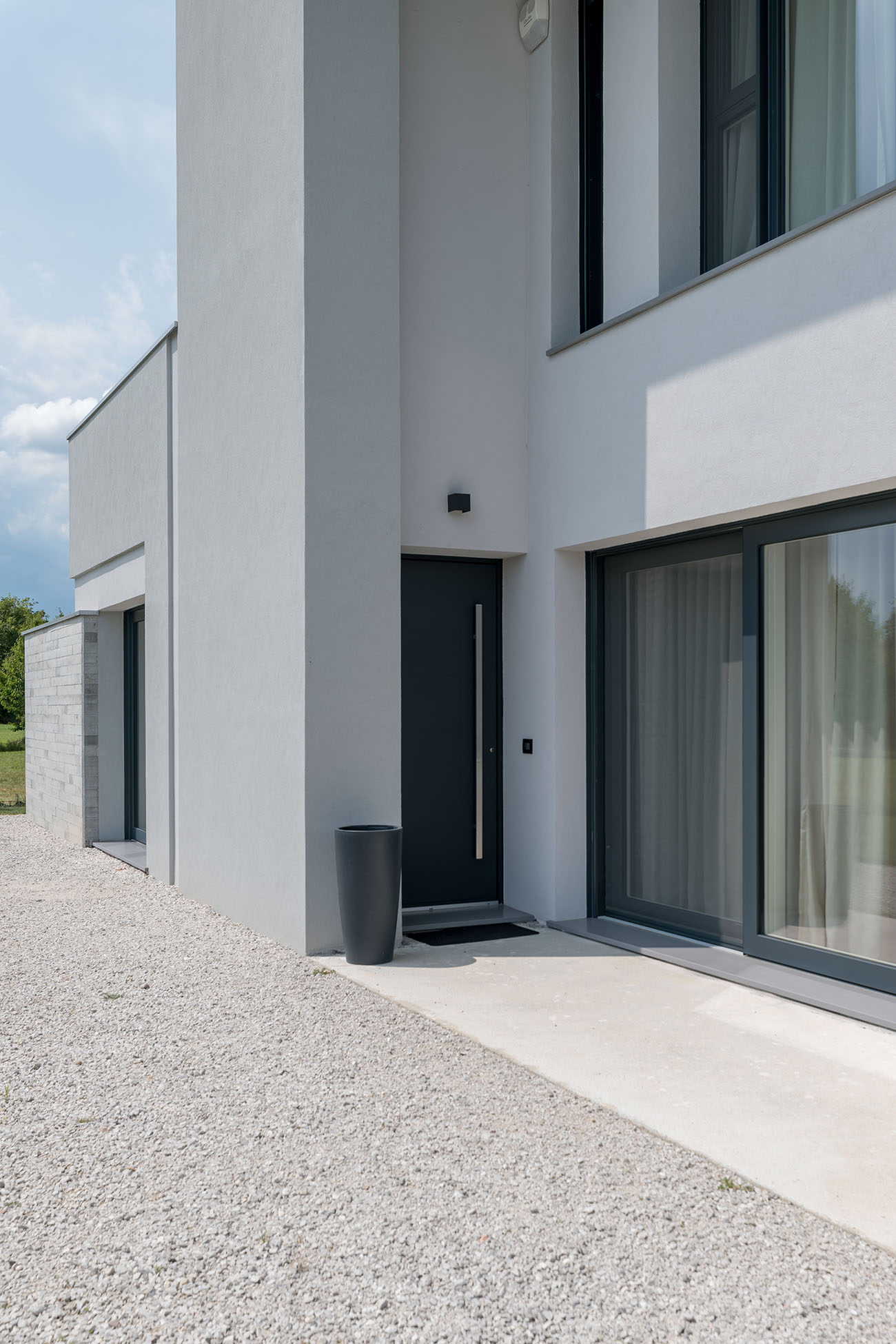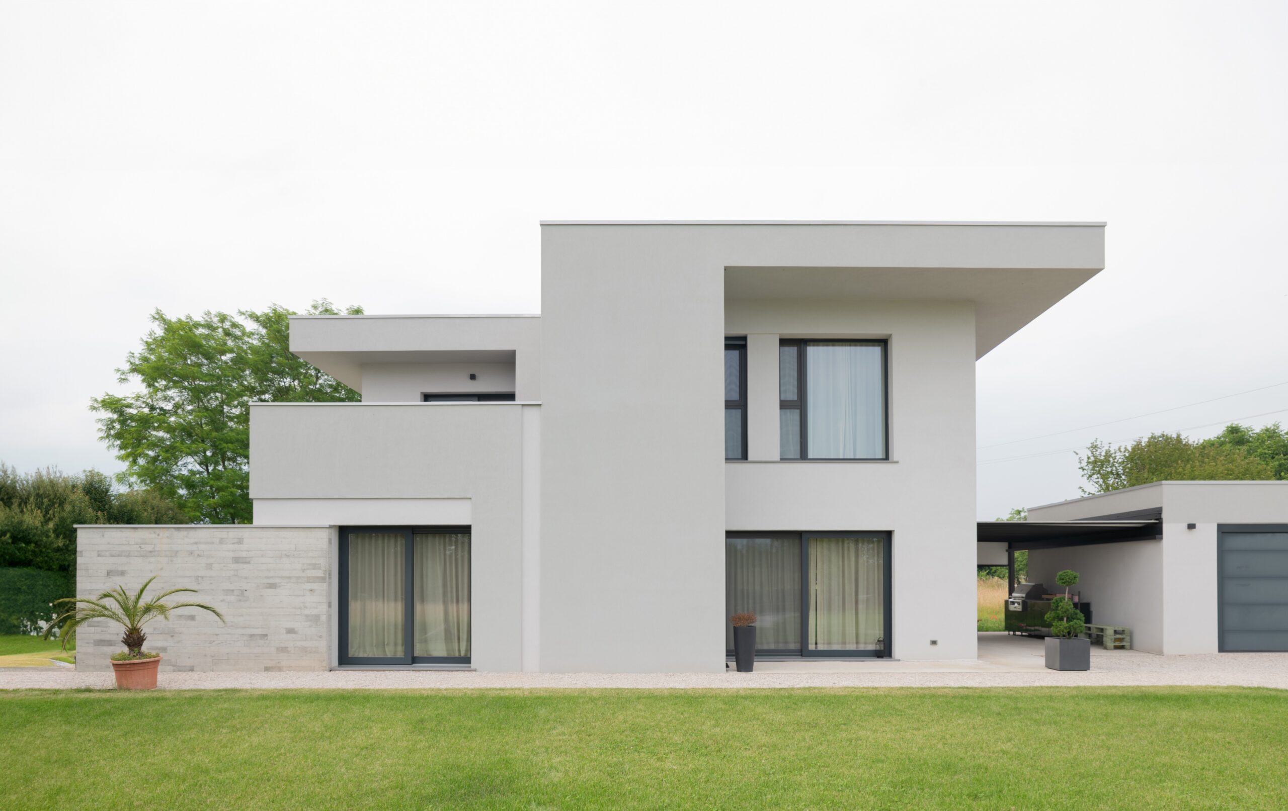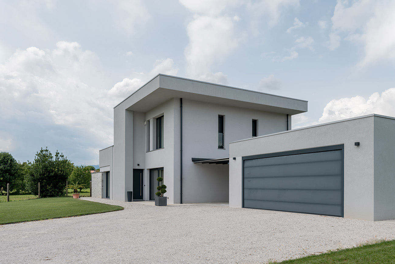 L'edificio si sviluppa su due piani, confrontandosi con un sito urbanisticamente residuale, collocato tra la zona semiperiferica abitata e la campagna agricola a sud. Il concept iniziale reinterpreta la volumetria di un fabbricato agricolo di scarso valore testimoniale, creando tre volumi principali interconnessi da piani sovrapposti. Le superfici materiche in calcestruzzo armato a vista e Lapitech si accostano a due cromie di base, conferendo all’edificio un carattere contemporaneo e robusto. L’abitazione è orientata in modo ottimale lungo l’asse eliotermico, con un'esposizione a sud che valorizza il paesaggio, arricchito dalla vegetazione circostante e dalla vista del Monte Grappa.