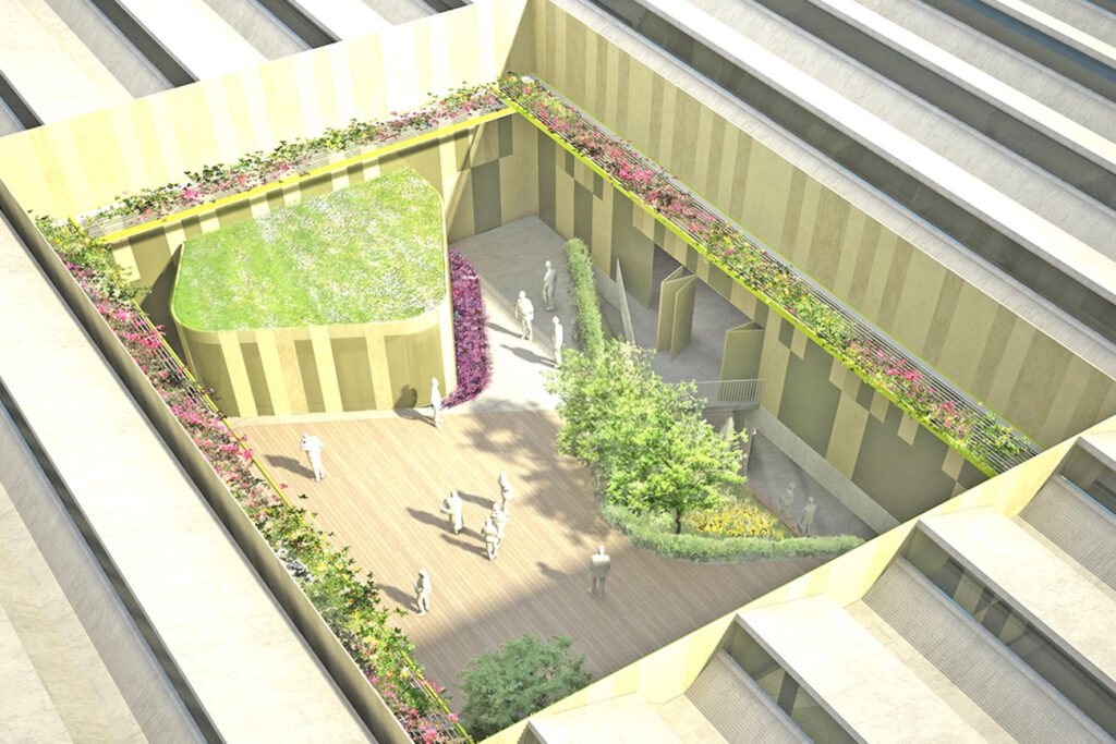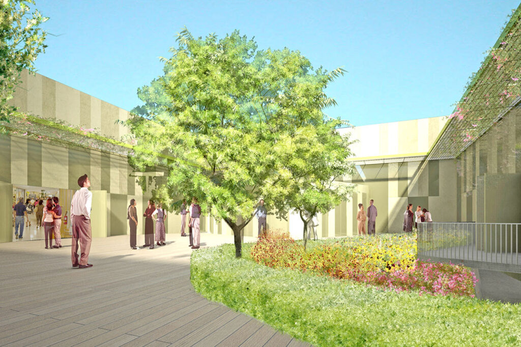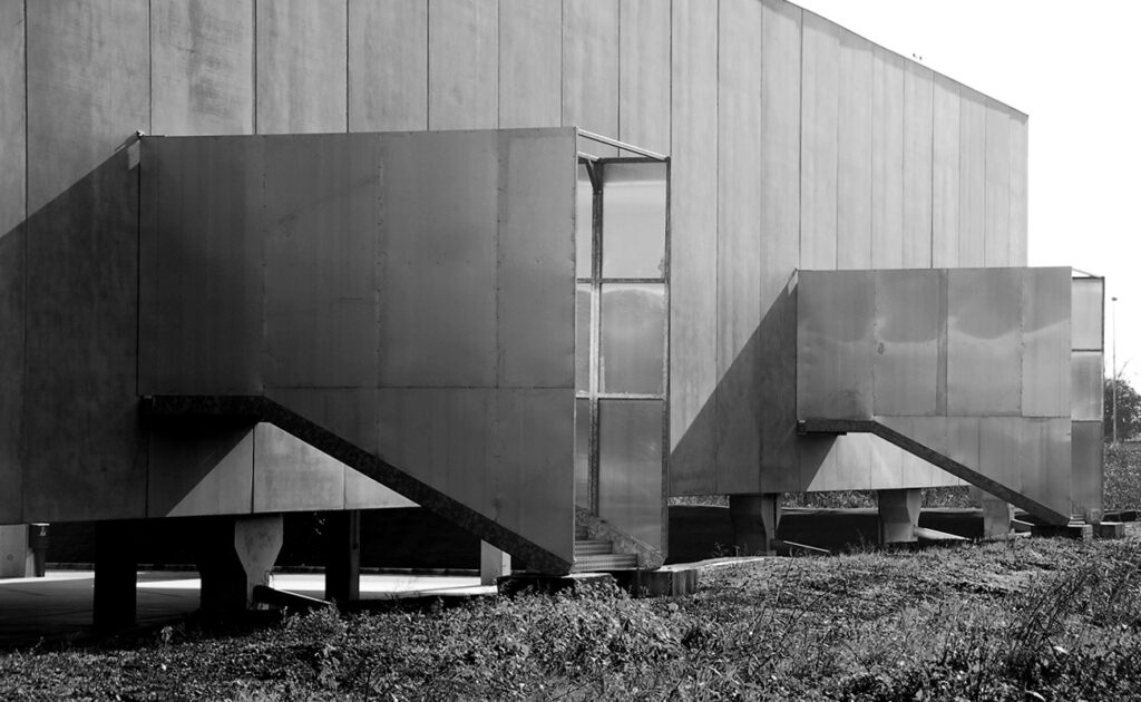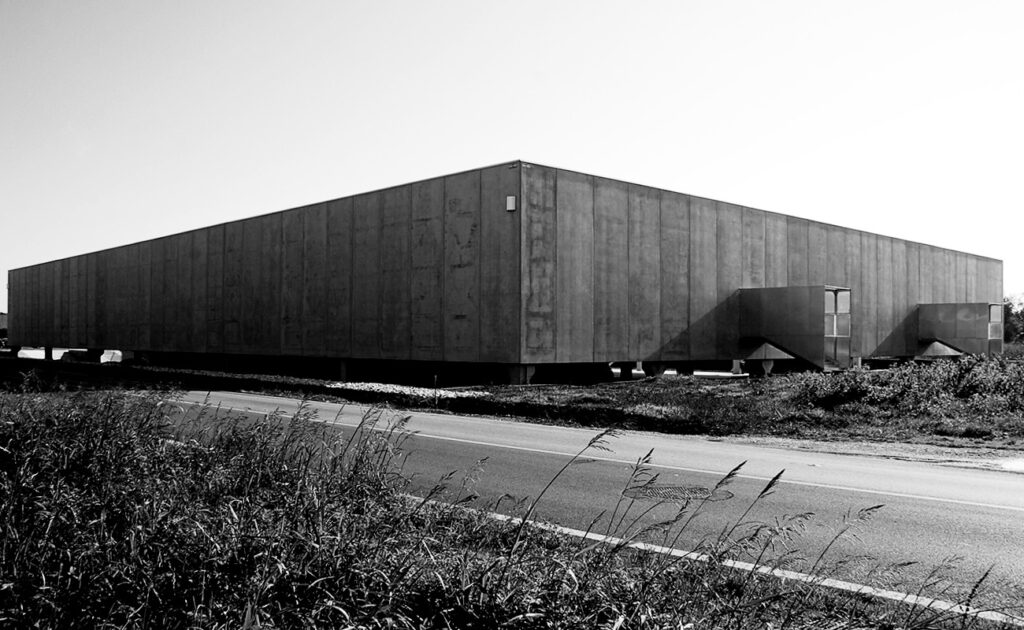 L'edificio commerciale, realizzato con prefabbricazione in calcestruzzo armato, è caratterizzato da un patio interno che genera un volume "scavato" e brutalista. Il design introverso valorizza il rapporto interno-esterno del patio, mentre il fronte sud si affaccia sulla strada commerciale, offrendo spazio per messaggi pubblicitari. Gli elementi tecnici esterni, come scale e rampe, sono evidenziati da lamiere zincate, esaltando l'estetica minimale dell'edificio.
