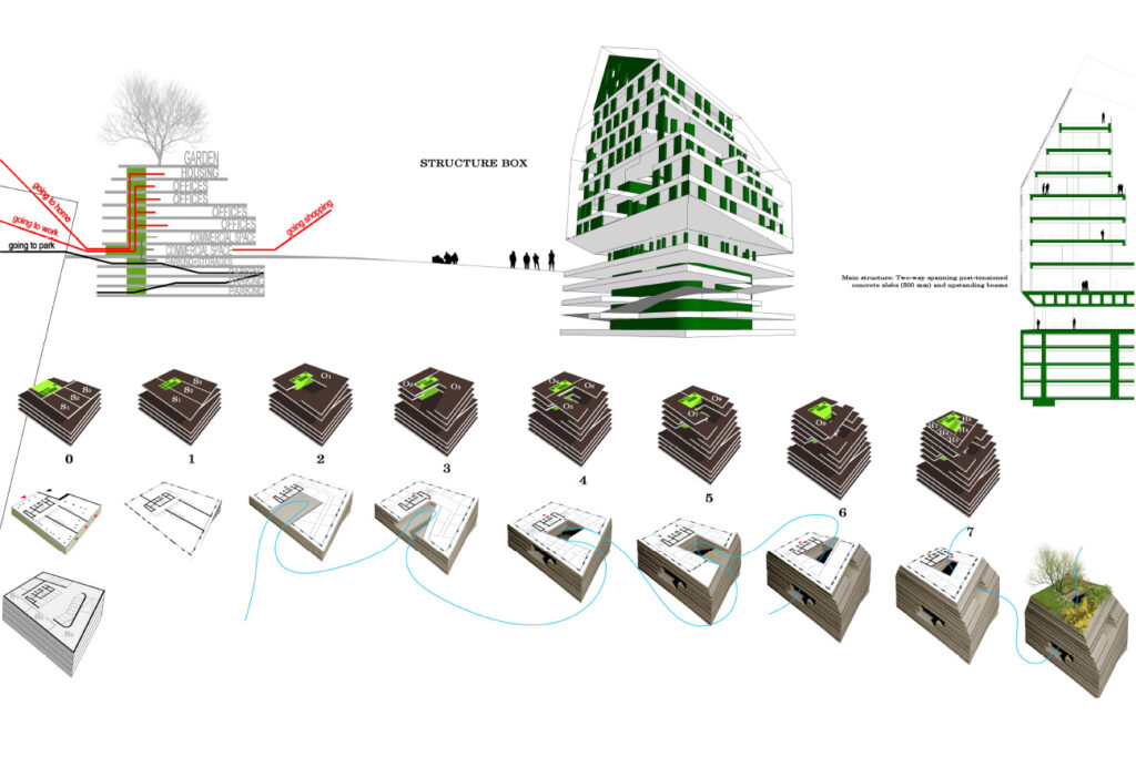 Il concept proposto per il flagship store United Colors of Benetton a Teheran, ispirato alla torre del vento, crea uno spazio introverso e scultoreo dove il corpo esterno interagisce passivamente con il contesto urbano. L’interno, scolpito come un solido cavo, offre al visitatore scorci di luce e materia, in un design stratigrafico e senza piani.